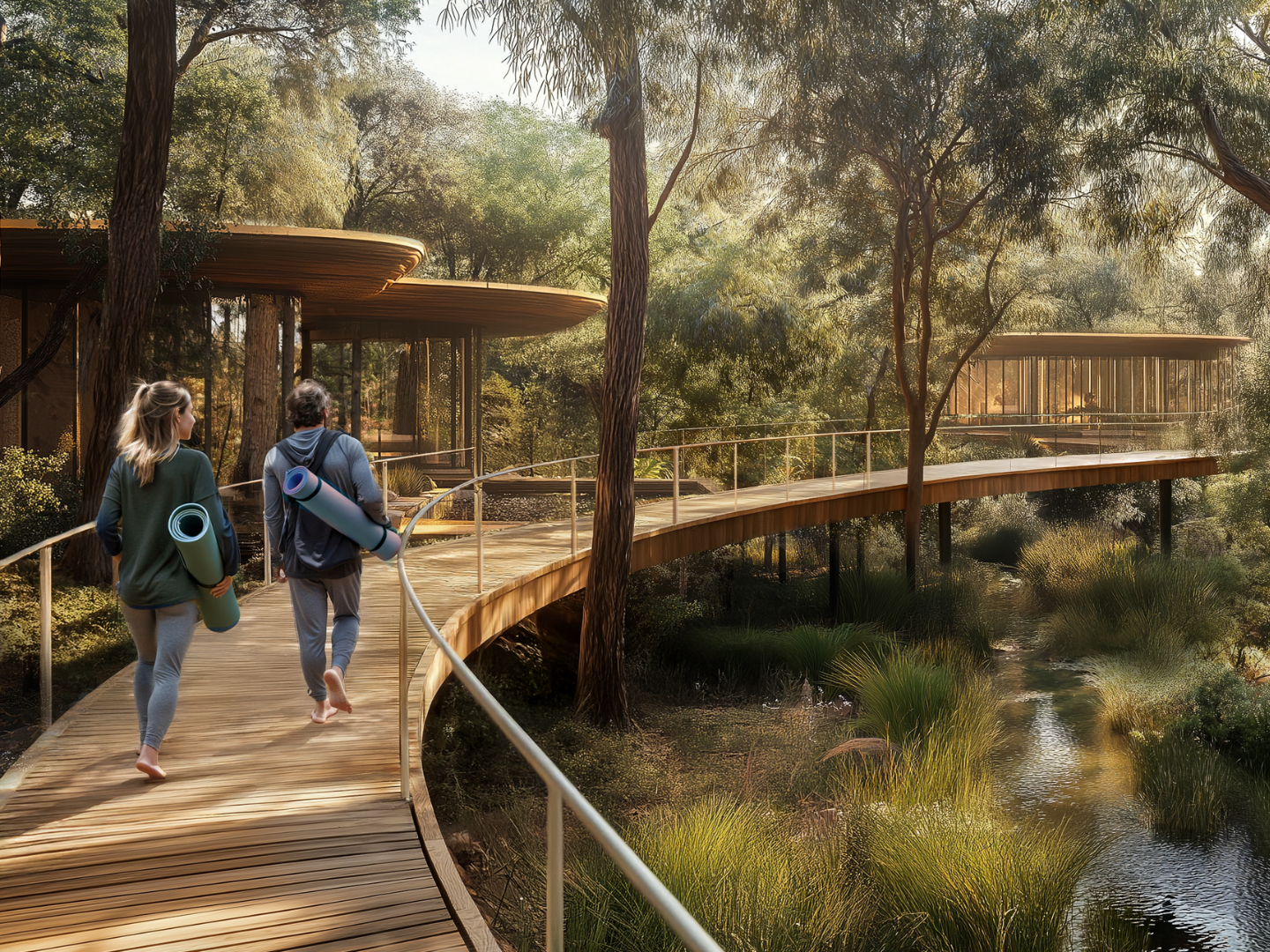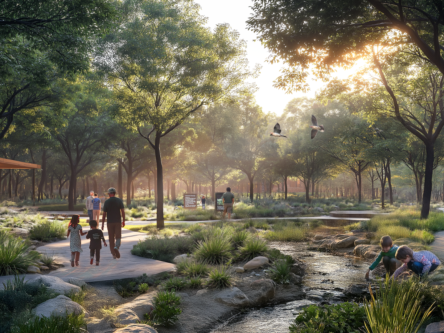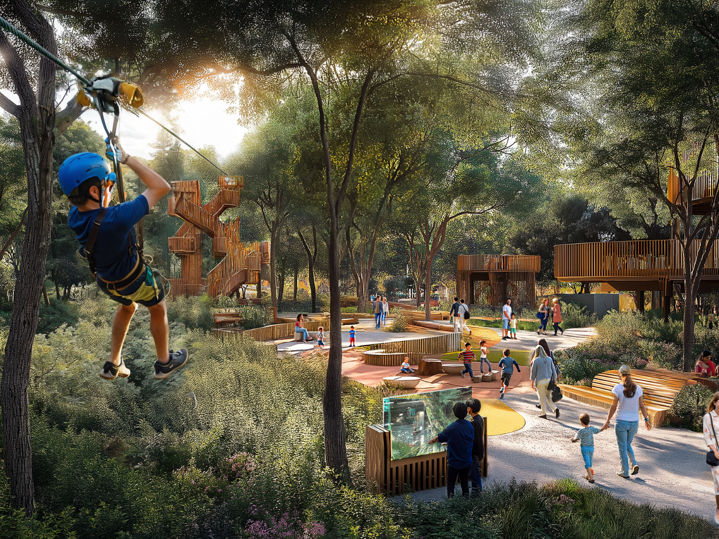 A series of thematic forests defines the site, each offering tailored spaces for creativity, well-being, play, and community. One million trees on site capture 22,000 metric tons of CO2 annually, interspersed between tranquil trails and vibrant civic plazas.