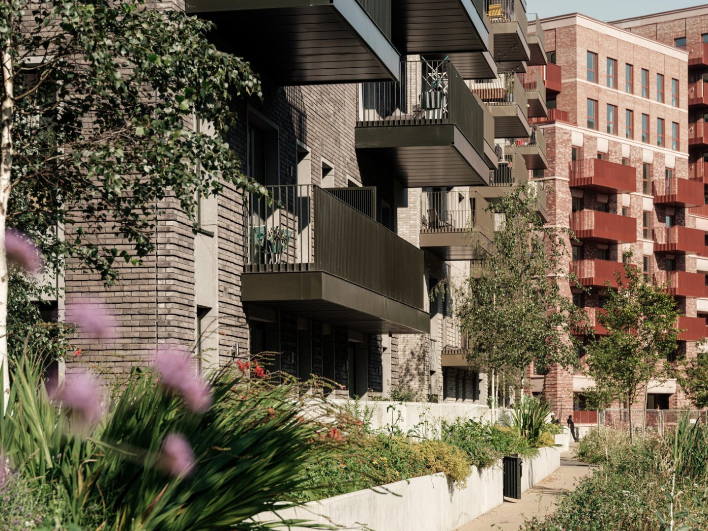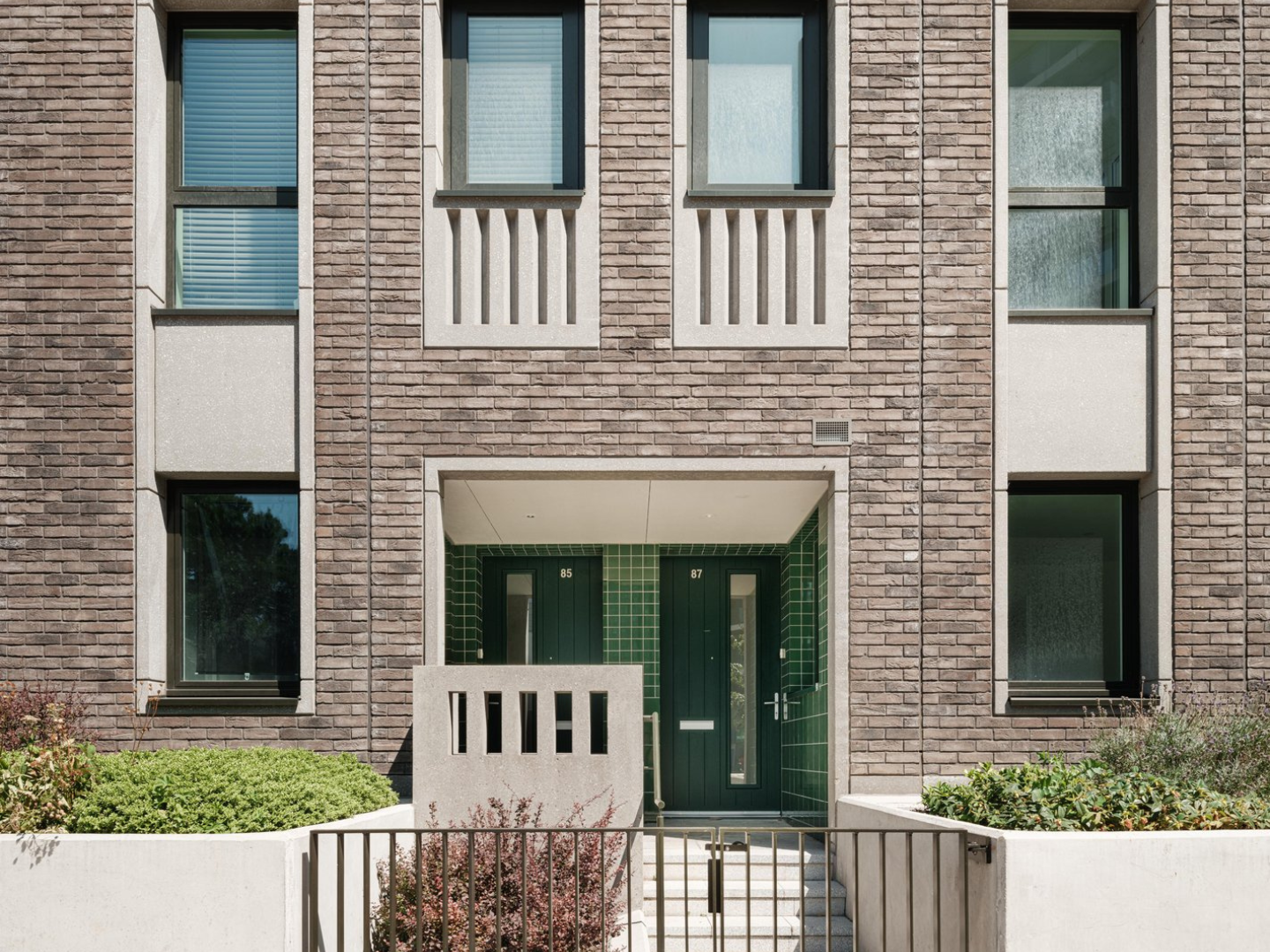 Each building incorporates maisonettes at ground level, with private terraces or raised entrances depending on orientation. This typology encourages family living, passive surveillance and direct engagement with the landscape. Homes along busy Cotton Street are buffered by deep planting and raised thresholds, improving privacy and acoustic comfort.
