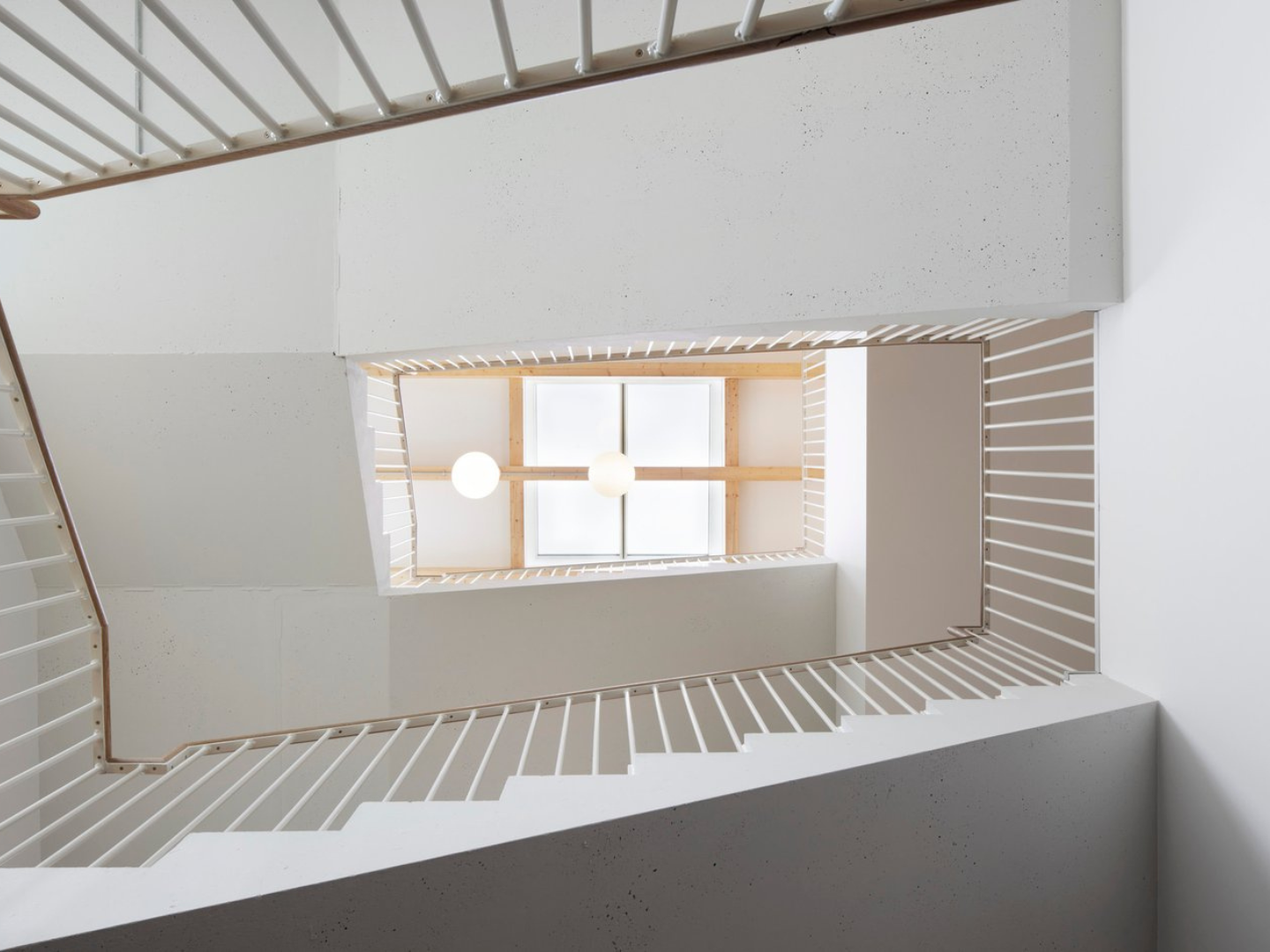 Internally, flexible spaces support both quiet study and collaborative learning, unified by a central double-height atrium and an oak-clad concrete spiral stair.