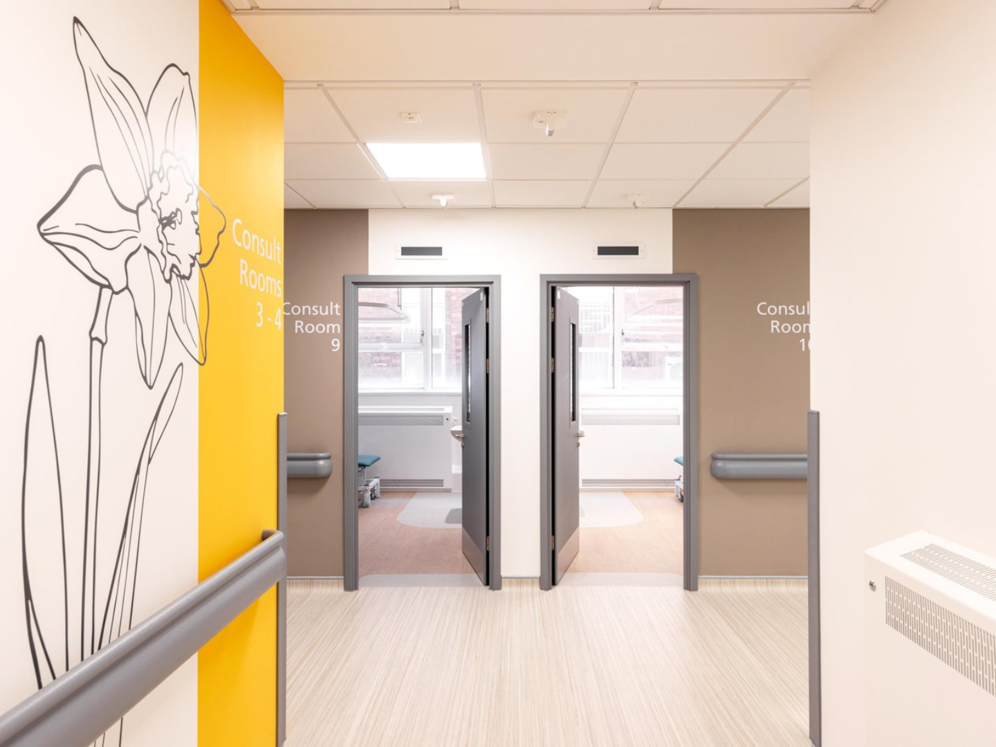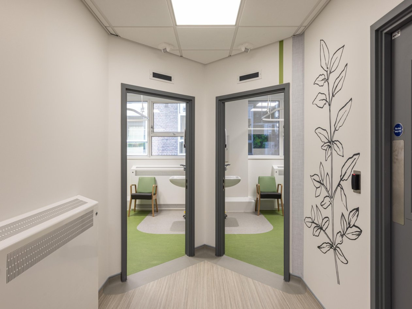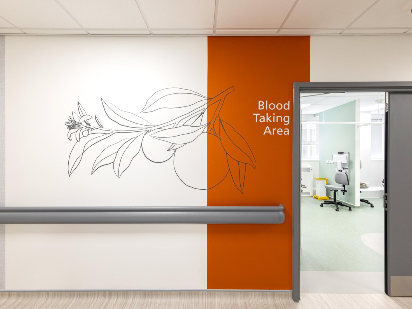 Located on the Ground Floor of an existing building on a dense hospital site, the space benefitted from windows on 3no. faces, but with restricted views and limited sunlight. The clinic rooms were designed to run down either side with an offset corridor, with waiting, offices and staff rest also making use of the natural light available. Natural light supports well-being of staff and visitors, but it was important to link the design to nature through the use of plant imagery, the use of colour and artwork.