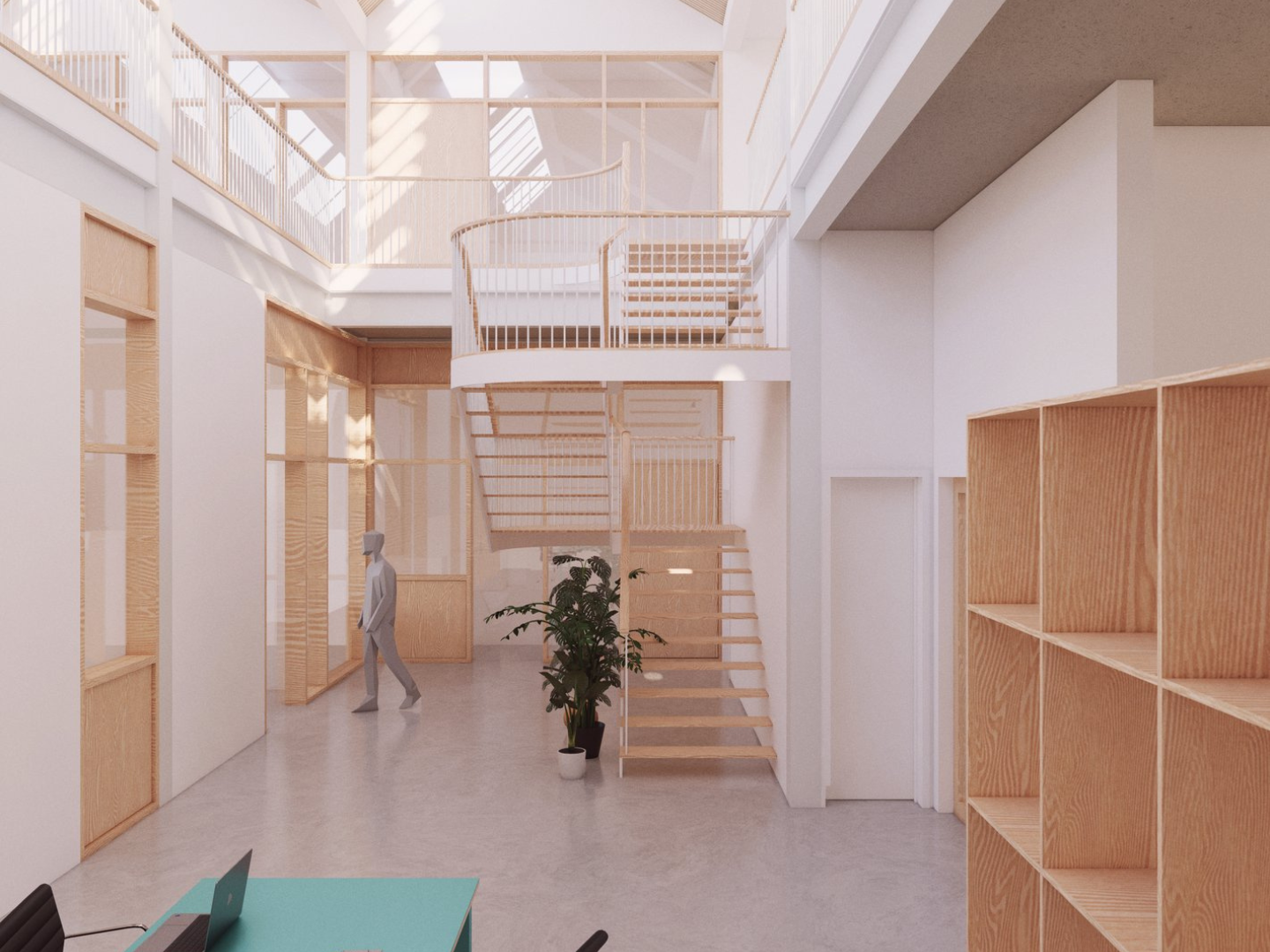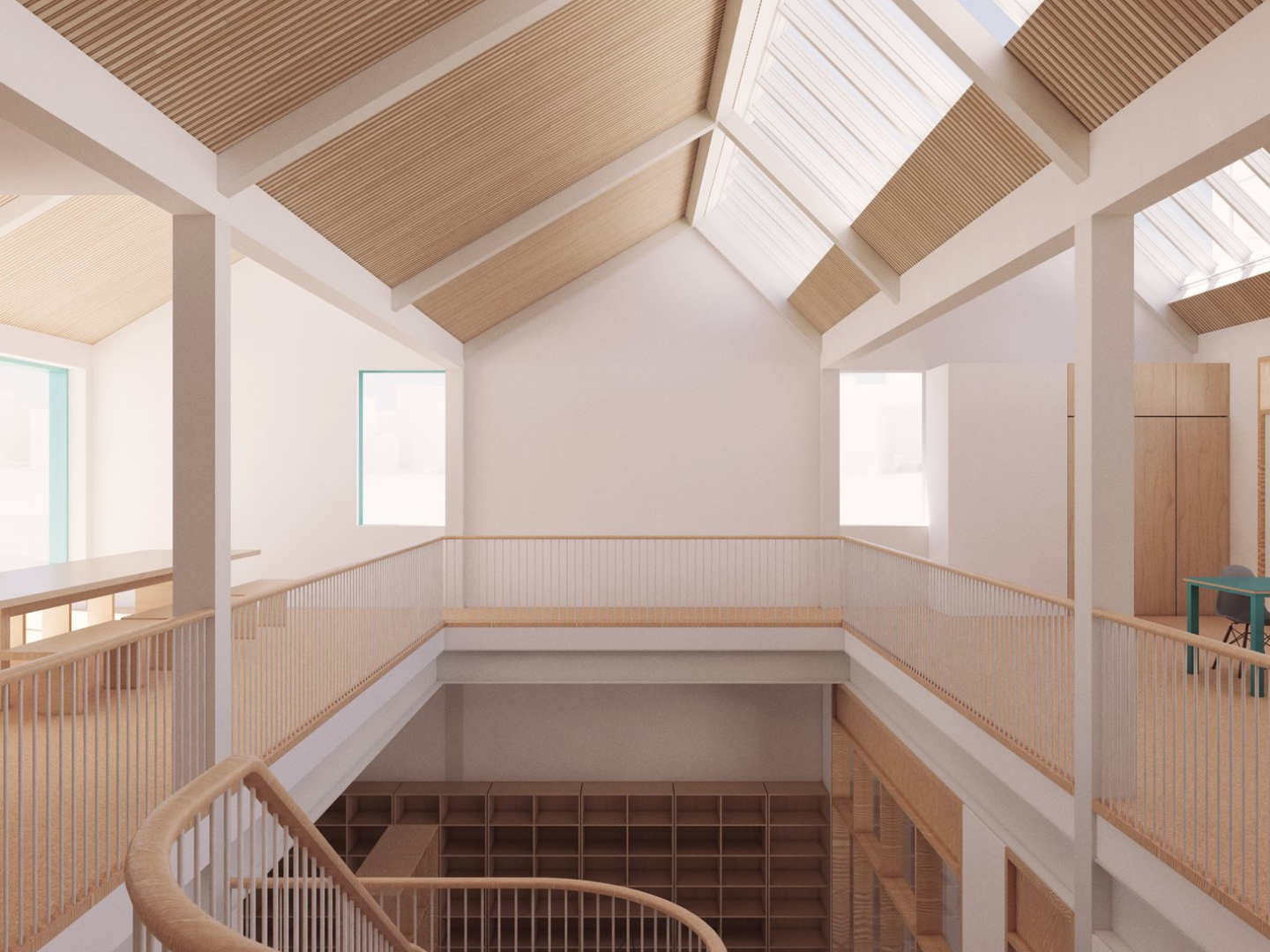 The workspace is anchored around a central atrium that brings natural light deep into the building and creates visual connections between production areas. At ground level, print workshops and preparation spaces benefit from controlled north light through a new northern lightwell, while customer service areas are positioned at the south end for easy access to the service yard. The upper floor houses the assembly studio, requiring exceptional daylight quality for intricate work, alongside administrative spaces and staff amenities including a south-facing terrace.