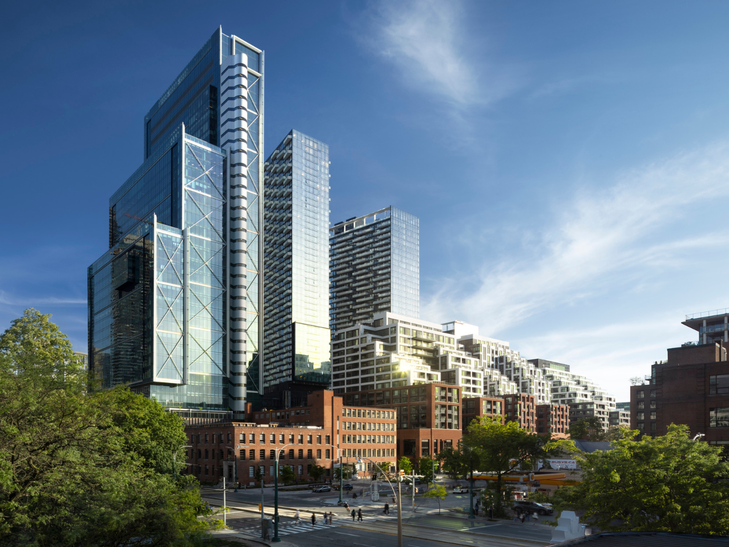 The new retail elements of the development, designed by BDP, create a unique environment in North America, drawing inspiration from urban models more commonly seen in Europe. The architectural character is strongly influenced by the neighbouring King Street West and Wellington West area. The design pays homage to the historical significance of its location, weaving elements of Toronto's industrial and publishing past into its modern architecture.