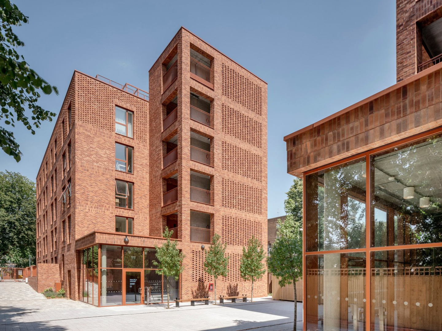 A key feature is the use of hit-and-miss brickwork. This technique allows light to filter through the stairwells, casting dynamic shadows on the recessed façades and within internal cores. It provides natural light to typically darker areas while adding a layer of texture and richness to the building’s materiality. Deep window reveals, recessed mortar joints and contrasting textures add depth, while large vertical openings frame views of the courtyard and surrounding greenery.