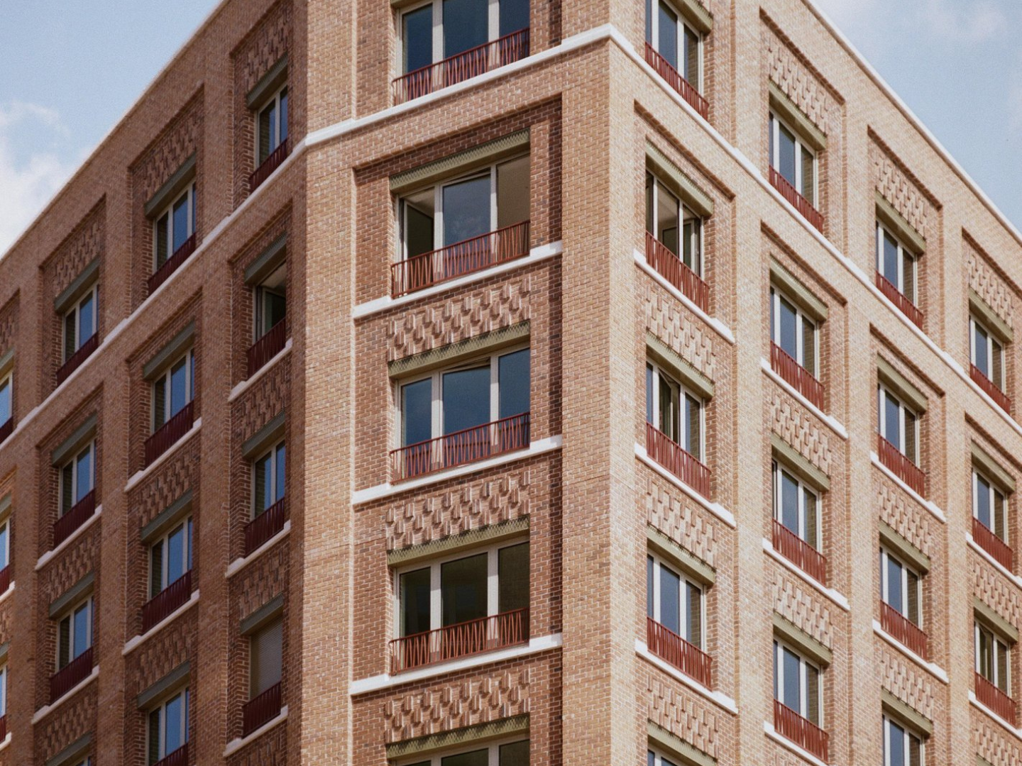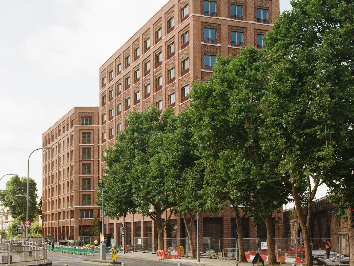 The two buildings facades have a similar character but there are subtle differences in composition and colour to provide variety and identity. Both follow a clear composition of base, middle and top, whereby the two-storey base aligns with the height of the viaduct. The gridded façades are formal, but brick pattern and colours add depth and interest.